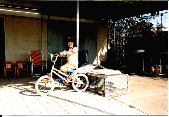 This is a photo of Melissa on her bike. She still rides with the little wheels on. At times she can ride without them.