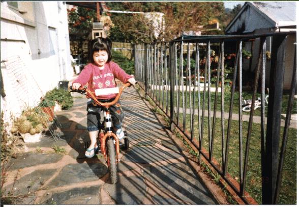 This is a photo of Stephanie on her bike. She can't cycle without the baby wheels yet. Home