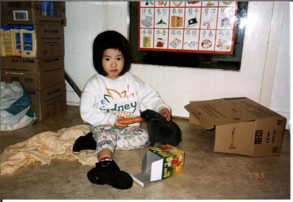 Welcome to this page This is a photo of Stephanie cuddling Topsey. Topsey is getting bigger now and so we leave him in his hutch out in the garden. Home